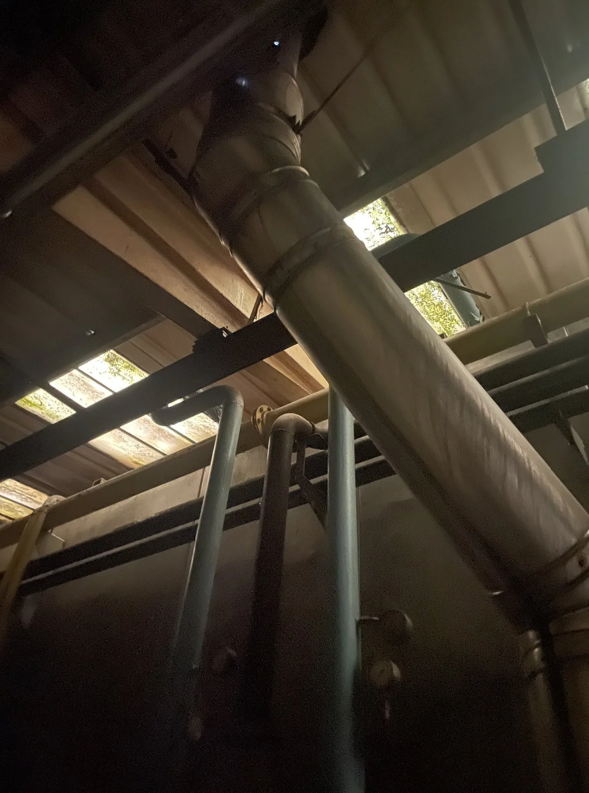 THE LARGE PIPES GOING UPWARDS AND TERMINATING IN THE ROOF